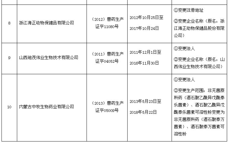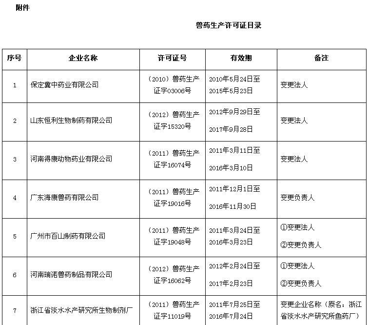 根据《兽药管理条例》规定,经审核,保定冀中药业有限公司等10家企业符合兽药生产许可证核发条件,现核发《兽药生产许可证》(详见附件)。