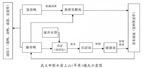在苗木基地内建圈养鸭舍、围栏、运动鸭滩和沐浴水围,抽取地下水注入水围供蛋鸭嬉戏沐浴,水围中的水经冲洗进入沉淀池,然后抽取到基地山顶储液池,再经管网系统灌溉施肥到苗木基地。鸭舍中的鸭粪则进入粪便发酵池,经无公害发酵处理后作为苗木有机肥料。该养殖模式在每个养殖场建立独立的活动场地,每m2饲养蛋鸭7~8羽每5000羽蛋鸭配套深度45cm,面积25~30m2的水围1-2个,水围每天冲洗换水1次,每周消毒1次,比传统的放养法更环保、健康、安全。
