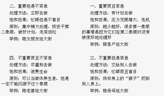 质量管理时间观之二——站对象限,积极主动。衡量一个质量人的时间观是否正确,不仅仅是看他花在工作上的时间,更应看花在那些事情上,如果是被动式反应,被动地处于救火员的身份上,不是消防员的思维,那么此类质量管理者又有多少含金量呢?因此我们必须紧盯质量管理方针和目标,站对时间管理的象限(处理方法参见如下附图),利用”PDCA”循环快速予以推进和落实。