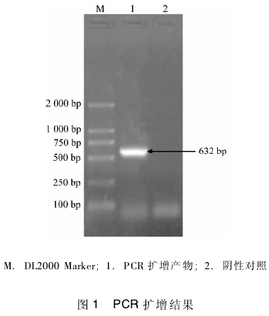PCR扩增与检测:以提取的DNA为模板,依据吴发兴等的方法进行PCR扩增。PCR结束后取5μL扩增产物经1%琼脂糖凝胶电泳初步进行片段大小的检测。电泳检测表明(如图1所示),临床组织病料PCR扩增产物在位于632bp大小处可见特异性DNA扩增条带,该结果与吴发兴等报道完全一致。