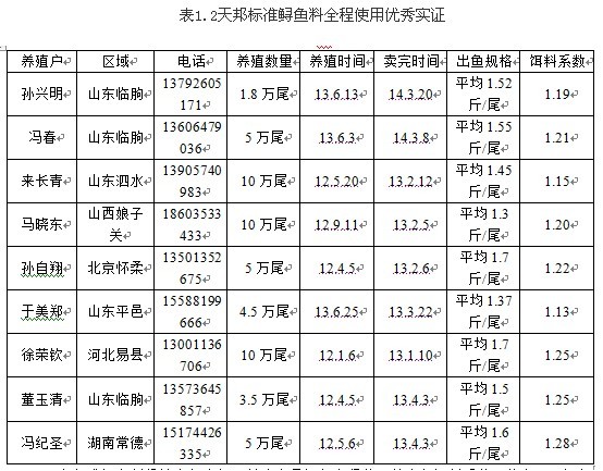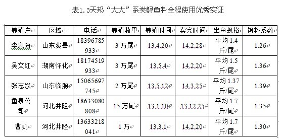 山东省莱州市叶家的郑老板2013年9月28日放大菱鲆鱼苗0.51万,规格100尾/斤,苗种价格1.9元/斤。养殖过程中全程使用天邦精制鲆鲽料,截止2014年2月24日分池称重,平均规格0.21斤/尾,大的0.4斤左右,总投喂量为0.41吨,在冬季水温偏低的情况下,饵料系数只有0.76,成活率达到99%,每包料可出鱼52.6斤!
