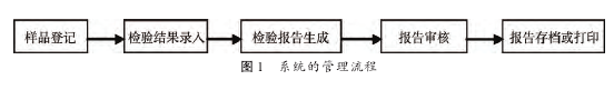 在分析饲料企业质检工作流程以及《规范》要求的基础上,设计系统的管理流程如图1所示。化验室接收样品后,需在系统中登记样品基础信息,系统会自动列出样品检验项目、检验方法和质量标准信息。针对录入的检验结果,系统根据质量标准中设置的值范围完成自动判断,根据检验记录可自动生成检验报告,经审核通过后即可存档或打印检验报告。