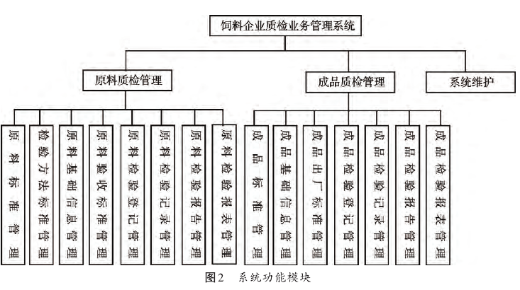 根据饲料企业质检工作管理需求,结合系统的管理流程,系统的功能按原料质检管理、成品质检管理和系统管理三个主要模块设计(见图2)。