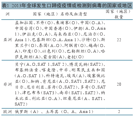 2013年,全球口蹄疫疫情集中在亚、非地区以及与亚洲相邻的欧洲部分地区暴发,共有44个国家或地区向OIE报告发生口蹄疫疫情或被OIE/FAO参考实验室分离到口蹄疫病毒(见表1)。其中,包括22个亚洲国家或地区、20个非洲国家、2个欧洲国家(俄罗斯和土耳其);南美地区口蹄疫疫情则得到有效控制,全年未有疫情发生。