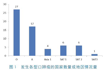 从血清型情况来看,报告发生或分离到O、A、Asia1SAT1、SAT2和SAT3型口蹄疫病毒的国家或地区数量情况见图1。