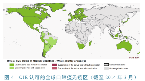 口蹄疫在过去呈世界性分布。欧洲、亚洲、非洲、美洲以及大洋洲在历史上都曾发生过口蹄疫。经过FAO、OIE等国际组织及各国的努力防控,口蹄疫已从广泛的世界性分布转变为局部区域性分布。近年来,欧洲和北美地区已基本消灭口蹄疫,2013年南美地区也未发生口蹄疫,66个国家或地区已被OIE认可为非免疫无口蹄疫国家或地区(图4)。未来一段时间内,亚非地区由于经济水平、养殖模式、防控管理能力等种种因素的影响,仍将是全球口蹄疫的主要集中地。但是随着东南亚-中国口蹄疫控制行动(SEACFMD)、南美地区“南方共同市场(Mercosur)无口蹄疫行动计划”(PAMA)的实施以及FAO/OIE制定的全球口蹄疫控制策略以及FAO制定的《口蹄疫阶段性控制途径》(PCP-FMD)的采用和指导,亚非地区的口蹄疫状况也会逐渐得到改善,全球口蹄疫无疫区将会继续扩大。