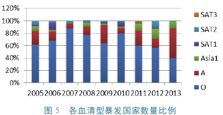 虽然至今口蹄疫各血清型的分布没有大的区域变化,O、A型口蹄疫依然呈广泛性分布,且A型口蹄疫的流行范围和暴发频率呈现扩大和增强的趋势。有专家认为2013年出现上述趋势与口蹄疫疫苗的免疫有一定关系,不少国家免疫以O型疫苗为主,O型感染率自然逐年下降,但A型口蹄疫缺乏免疫,感染率开始上升。由于东南亚地区是A型口蹄疫的疫源地,目前疫情已扩散至蒙古、俄罗斯、哈萨克斯坦等多个国家,因此包括中国在内的整个亚洲地区受到O、A型口蹄疫的严重威胁,将会成为今后亚洲地区防控的重点(图5)。另外,从近几年OIE和OIE/FAO参考实验室的数据分析,虽然AsiaI型和南非型口蹄疫分布相对集中,但也无法阻止其向外扩散。2005年,AsiaI型口蹄疫曾扩散到中国、俄罗斯和蒙古;SAT2型在2000年曾跨过赤道和红海,散播到沙特和科威特。特别是随着全球畜产品贸易的不断增多和频繁,这种扩散风险将会逐渐加大。