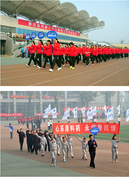 10月18日,在公司即将迎来建业48周年之际,鲁抗医药广大员工在山东理工职业学院体育场上共同迎来了公司的体育盛会----第二十三届员工田径运动会。上午8点20分,随着公司党委委员、工会主席崔晓辉的一声“鲁抗医药第二十三届员工田径运动会开幕式现在开始,请裁判员、运动员入场!”,激越的《运动员进行曲》在体育场上空应声响起,来自34个基层单位的600多名运动员在国旗、运动会会徽和厂旗,花环方队、红旗方队和厂旗方队的引导下,迈着矫健整齐的步伐走过主席台。公司领导颜骏廷、张雪岩、赵伟、崔晓辉、彭欣、李红参加了开幕式。