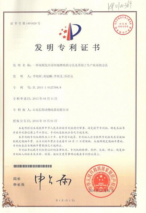 信得科技“一种规模化培养细胞增殖的方法及其用于生产病毒的方法”于2014年10月获得专利批准。专利号【ZL 2013 1 0127308.8】。该发明可解决生产病毒时细胞系体积小,细胞密度小,不能满足大规模生产病毒疫苗的要求的问题。