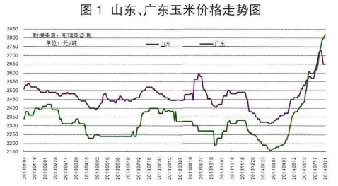 本轮玉米从3月末至今强势上涨,广东地区涨幅接近400元/吨。7月末广东港口玉米价格一度上涨至2700~2750元/吨,8月份随着湖南及广西夏玉米上市,价格出现小幅回落。但8月中旬山东地区玉米收购价格仍然强势,上涨至2820元/吨。