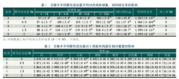 日粮中不同酵母的添加量对肉鸡体增重、耗料量和饲料转化率的影响见表1。试验结果表明,在整个试验阶段(3周),与处理1和处理2相比,处理3、4、5组肉鸡的体增重显著增加(P<0.05),处理4和5组最明显。此外,采食量和饲料转化率也显著提高(P<0.05)。在所有处理组中无肉鸡死亡的记录。各试验处理组肉鸡的器官相对重量没有显著差异(见表2)。