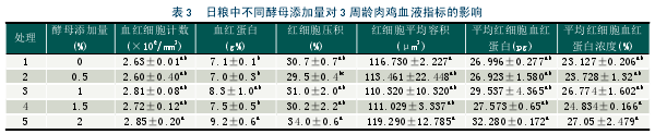 当日粮中酵母的添加量为0.5%、1%、1.5%、2%时,血红细胞计数、红细胞压积、红细胞平均容积、平均红细胞血红蛋白、平均红细胞血红蛋白浓度没有受到影响,除了酵母添加量为2%的处理组在提高血红蛋白参数上与其他处理组间存在显著差异(P<0.05)。总体来说,当酵母的添加量为2%时,试验结果最佳(见表3)。