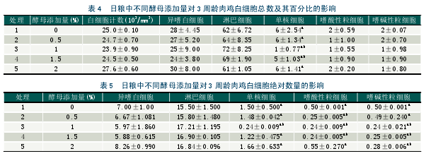 在所有试验处理组中,肉鸡都未出现白细胞总数减少的现象。与对照组相比,所有添加酵母的日粮处理组中,肉鸡血液中异嗜白细胞、淋巴细胞、单核细胞、嗜酸性粒细胞和嗜碱性粒细胞的百分比含量未出现变化(见表4),并且其绝对数量也未出现变化(见表5)。