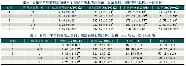 与其他处理组相比,当日粮中酵母的添加量为1%、1.5%和2%时,血清总蛋白含量显著提高(P<0.05)。所有添加酵母的日粮处理组肉鸡的血清甘油三酯显著降低(P<0.05),但只有在酵母添加量最高(2%)时,血清胆固醇水平与对照组相比显著下降。日粮中添加酵母对肉鸡血清钙水平没有影响(见表6)。