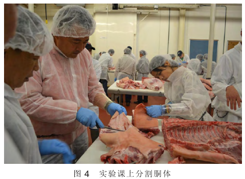 在南达科他州大学的肉品课上,Keith教授给我们讲解肉品知识、肌肉成分,讲解肉品嫩、多汁、好吃和柴、干、口感不好的原因,讲解要保持肉的风味应如何加工、如何在屠宰过程中最大程度地保证肉品的质量等内容。在教授的实验室里,大家穿大褂(大褂上的衣兜全部在里面)、带帽子、套雨靴,左胳膊套上硬筒状的套袖,左手带防切手套,右手带普通手套,每5人一组,进行半片猪胴体的分割工作(图4),按要求分块、去皮、剔骨、分离出眼肌肉,整理好前后腿肉和五花肉,大家既好奇又卖力气地用锯子拉、用刀子切,全成了不熟练的屠夫。教授把大家分割的几个等级的猪肉亲自烤好,切开来让我们一一品尝打分,记录大家喜欢哪个等级、几分熟的猪肉。大家看着Keith教授像烤串师傅一样忙里忙外地为我们服务,都感慨不已:在国内看到的教授都是老板,指挥下面的学生做事,而这里的教授事必躬亲,亲自动手,理论联系实际。