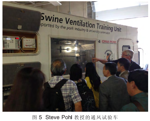 通风量是否达标、风速是否符合要求、如何知道通风的效果是满足要求的,StevePohl教授用他实验室的改装箱车(图5)来演示;箱车一端装着两个大小不等的风机,箱体顶部有两个自动开关的窗户,车尾顶部有一个可开放、闭合的进气口;教授按动手中的开关,大家轮流到车厢中用风速仪、温度计检测箱车中不同部位的风速、温度,并用示踪物来观察车厢中空气的流向;随着一遍遍的演示和测算,枯燥的理论变成了看得见、摸得着、测得出、算得准的实物。