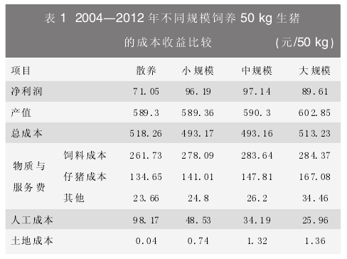 产值与生猪价格和产量有关,由于本文采用的生猪衡量单位为“每50kg”,所以每50kg生猪的产值就是每50kg生猪的出售价格,不再涉及产量的讨论。从不同规模每50kg生猪的产值2004—2012年间的均值看,大规模的产值略高,但差异不大(表1),说明造成净利润差异的主要因素不是产值是成本。