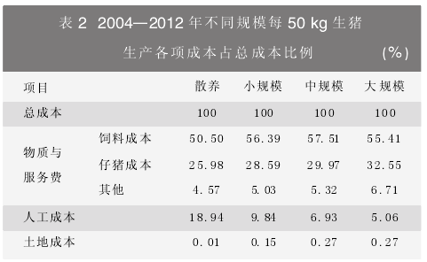 2004—2012年期间,从每50kg生猪的人工成本看,饲养规模越大,投入的人工成本就越小(表1),散养的人工成本比大规模养殖高出278.16%。