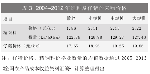 (1)饲料成本2004—2012年期间,从每50kg生猪的饲料成本看,大规模>中规模>小规模>散养(表1),可见,规模越大,饲料成本越高,大规模的饲料成本比散养高出8.65%。从生猪食用的精饲料角度进行分析,有两个原因,一是采购的饲料价格存在差异,从表3可知,规模越大价格越高。二是采购饲料的数量差异,大规模和中规模较高(表3)。
