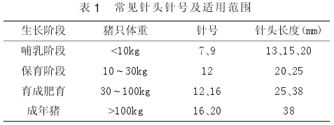 根据猪只体重大小,选择适合的针头,常见标准见表1。