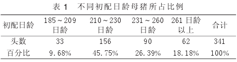 大白猪原名约克夏猪,是世界著名品种,特征为毛色全白,体躯长且健壮,头长,脸微凹,耳大直立。具有适应性强、繁殖力高、生长速度快、饲料利用率高、瘦肉率高、肉色好等优点。由于猪只繁殖性能直接影响原种猪场的生产成绩,而初配日龄对母猪的繁殖性能影响最大。如果初配日龄过早,影响后备母猪自身发育,且所产仔猪数量少,体重偏轻;如果初配日龄过晚,会造成母猪躁动,影响其正常生理活动,而且会降低母猪的使用年限,影响经济效益。本次生产试验的目的是为了确定该品种在四川某集团公司原种猪场饲养条件下初配日龄对母猪繁殖性能的影响。