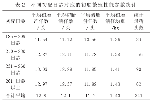 2.2不同初配日龄对后备母猪初胎繁殖性能的影响