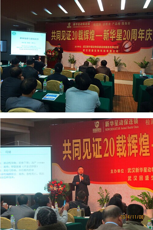 借周年庆契机,新华星联合母公司武汉回盛共同拉开了“猪呼吸道疾病防治全国巡回大讲坛”第四站---湖北站的序幕。大会盛情邀请了国内知名的动物疾病防控与诊治专家、华中农业大学教授、博士生导师何启盖教授,国内资深技术服务专家唐万勇老师前来授课,为广大养猪同仁提供猪场疾病防治方案和服务对策,现场解答客户们的疑问,会场气氛热烈,听课热情高涨。