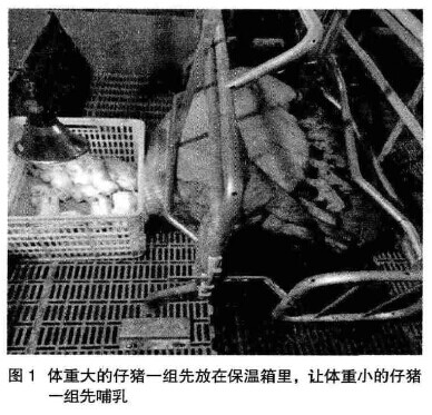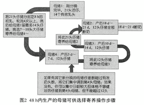 有时没有在 48 h 内生产的母猪可供选择寄养,在这种情况下,我们需要找出其他方法,因为让太多的仔猪留在母猪身边,它们将很难都存活下来,具体操作步骤如图 2:这种操作方法简单易行,在实际生产中意义重大。