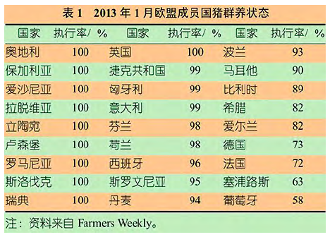 2013年2月,欧盟公布了不同国家实施猪群养的官方概况(表1)。官方数据显示,10个国家已全面实施了妊娠母猪群养条例,一些国家几乎准备妥当,但另一些国家还有更长的路要走。