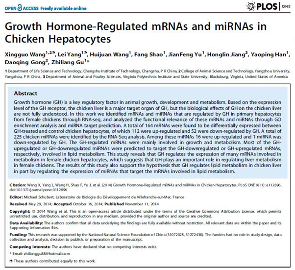 派森诺生物与常熟理工学院顾志良教授携手合作,应用转录组测序和small RNA测序的方法,对GH刺激鸡原代肝细胞后,鸡原代肝细胞中mRNA和miRNA的表达情况进行研究,揭示了miRNA与靶基因之间的调控关系。研究成果《Growth Hormone-Regulated mRNAs and miRNAs in Chicken Hepatocytes》于2014年11月发表在《PLOS ONE》上。