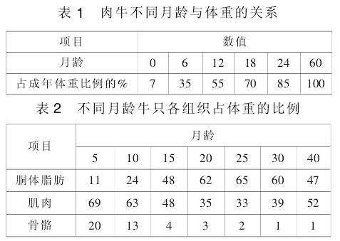 按照不同月龄体重的生长规律来确定种公牛的饲养方案。表1为不同月龄与体重的关系,表2为不同月龄牛只各组织占体重的比例。