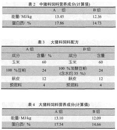 试验分两阶段进行,第一阶段(6月11日~7月28日)使用中猪料,第二阶段(7月29日~9月13日)使用大猪料,饲料配方及营养成分见下表1~表4。