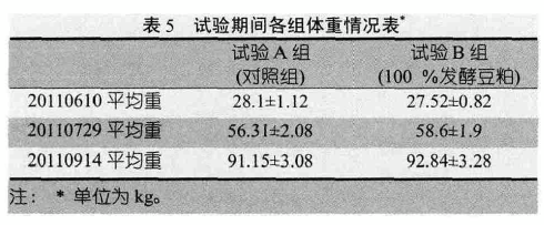 从表5我们分析,A组和B组初始平均重分别为28.1kg±1.12kg和27.52kg±0.82kg,49d后也就是2011年7月29日,他们平均重分别为56.31kg±2.08kg和58.6kg±1.9kg,94d后,即2011年9月14日,他们平均重分别为91.15kg±3.08kg和92.84kg±3.28kg,可以看出,B组增重比A组多,但差异不显著。