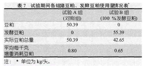 试验期间各组猪豆粕、发酵豆粕使用量情况表见表7。