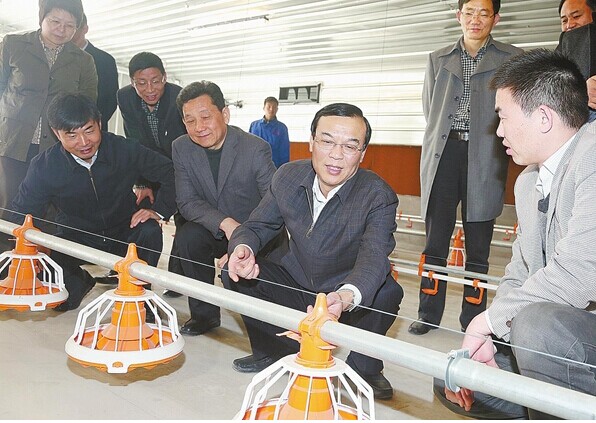 在第七商品鸡场,马正跃与企业负责人亲切交谈。“双汇5000万只肉鸡产业化项目不仅单体投资最大、技术含量最高、产业链条最全,而且是全球同行业建设速度最快的。从去年11月份全面开工,在市、县、乡有关部门的大力支持下,仅用一年时间,34个鸡场已陆续建成,负责安装设备的德国供应商对我们的建设速度感到惊叹!”双汇投资发展公司农牧事业部总经理雷永辉自豪地说。“好!对于这样的项目,我们就是要给予高度重视和大力支持!”马正跃勉励企业负责人要把这一项目“打造成为同行业标杆”。