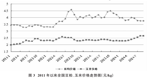 2014年4月中旬以来,得益于国家临储政策垫底,生猪价格逆市反弹,鸡蛋价格高涨,玉米行情持续升温,8月下旬玉米现货价格已涨至2800元/t左右,突破2009年以来的历史最高水平。随着玉米价格上扬,饲料价格也不断上涨,2014年以来,豆粕价格虽有回落,但仍处于较高水平。因此,面对当前生猪价格和鸡蛋价格齐头并进的利好形势,许多养殖户在欣喜之余略显惆怅,因为高涨的玉米价格正在严重侵蚀着畜产品价格上涨带来的利润空间,养殖业依然处于亏损边缘。2014年前三季度全国玉米价格平均为2.43元/kg,比2013年同期的2.34元/kg高0.09元;9月25日为2.69元/kg,比2013年同日的2.36元/kg高0.33元。2014年前三季度全国豆粕价格平均为3.86元/kg,比2013年同期的4.16元/kg低0.30元;9月25日为3.64元/kg,比2013年同日的4.46元/kg便宜0.82元。2014年9月第3周全国肉鸡配合饲料和蛋鸡配合饲料平均价格分别为3.48元/kg和3.21元/kg,同比分别上涨1.5%和1.9%。