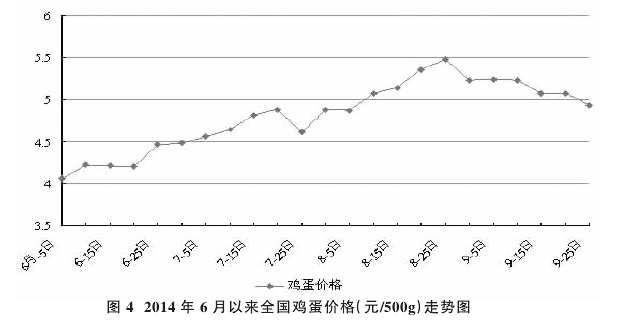 每年的5月和9月,鸡蛋价格几乎都会出现很明显的高起波段,其原因主要是端午节和中秋节前消费者对鸡蛋需求的增加,这也在一定程度上加重市场供给偏紧格局。而2014年中秋节前禽蛋价格小幅回落主要原因在于:一是前期鸡蛋价格上涨较为迅猛,在一定程度上抑制了消费,给鸡蛋价格下跌留有充足的空间;二是上半年补栏的雏鸡开始进入产蛋期,存栏增加,鸡蛋的库存量也增加,青黄不接的局面得到了缓解;三是天气转凉,舒适的气候使得蛋鸡产蛋率出现季节性恢复,供应强于前期。四是鸡蛋消费高峰期已过,加上南方雨水天气运输受阻,走货速度减缓,蛋价出现弱势下跌。