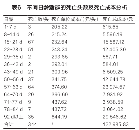 生产管理者每月需关注不同日龄的死亡头数及死亡成本情况,因为这反映了疾病与日龄的关系,例如表6中18~28日龄死亡118头,53~70日龄死亡64头。猪场管理者可以以死亡头数较多和死亡成本较大阶段的猪群为重点管理对象,采取措施提高生产成绩(表6)。