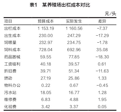 通过预算成本与实际发生成本对比找出成本差异,例如某养殖场育肥猪8月份实际出栏成本1160.56元/头,较预算成本1153.19元/头升高7.37元/头,通过差额对比确定成本控制方向,为进一步找出成本控制点,对出栏成本按照成本科目对比如表1。