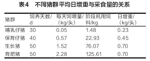 通过实际饲喂量与目标饲喂量,实际日增重与目标日增重的对比分析,找出平均日增重和采食量的关系,通过调整饲料配方、质量等措施提高饲料转化率(表4)。