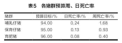 日常生产过程,为有效控制生猪死亡率,做到防患于未然,分场管理者需每天关注各商品猪群的死亡情况,通过实际死亡率与目标死亡率对比分析,比如可以关注生产过程中无饲养价值的猪只淘汰情况,同时按照疾病统计不同猪群发病情况,找出管理差距(表5)。