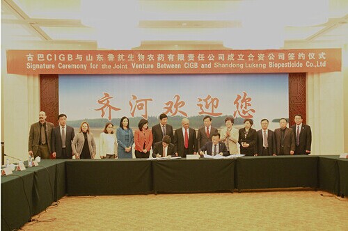 签约仪式上,王晓东代表县政府致欢迎词,介绍了齐河县经济情况,对合资项目正式签约表示祝贺。郭琴、卡洛斯分别代表中方和古巴方致辞,介绍了合资项目情况。彭欣和古巴CIGB副主任艾乌洛何尤分别代表生物农药公司和古巴CIGB签署了合资合同、合资公司章程及技术转让协议三个合资项目框架文件。