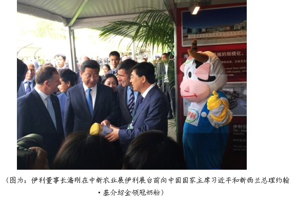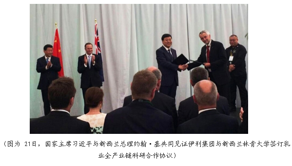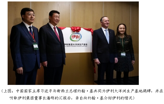 新西兰当地时间11月21日,在习近平与新西兰总理约翰·基的共同见证下,中新两国在经济领域取得了一系列的务实合作。其中,伊利集团总体投资额达到30亿人民币的乳业项目尤为引人瞩目。这一金额不但创下了中新两国有史以来投资规模的历史记录;由于其同时覆盖包装,生产、深加工、科研等多个领域,一旦完工即将成为全球目前最大的一体化乳业基地。习近平主席与约翰·基总理共同为伊利大洋洲生产基地揭牌,同时见证了伊利等相关多项合作协议的签署。这是中新两国一揽子合作中首个揭牌的项目。