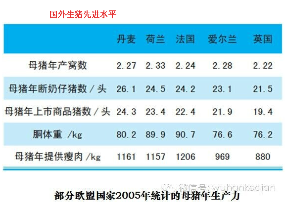 国内生猪生产力低 2011年,中国猪平均存栏量4.68亿头,其中年底母猪存栏4929万头,总出栏量6.62亿头,根据存栏母猪数和出栏猪数量计算,每头母猪年提供出栏猪只有13.4头,而且出栏率还有进一步下降的趋势。国内生产水平与国外先进水平比相差甚远!