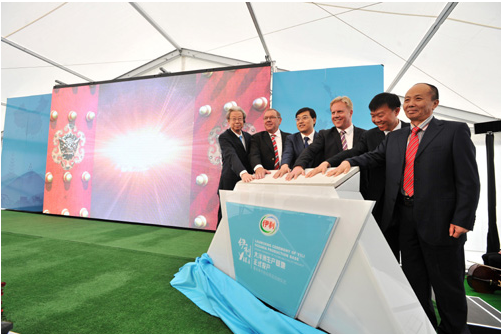 图为:新西兰贸易部部长 McClay、奶农代表、中国驻新西兰大使馆商务参赞张帆、中国乳协名誉理事长宋昆冈、中国奶协副会长兼秘书长谷继承和伊利集团董事长潘刚共同启动伊利大洋洲生产基地