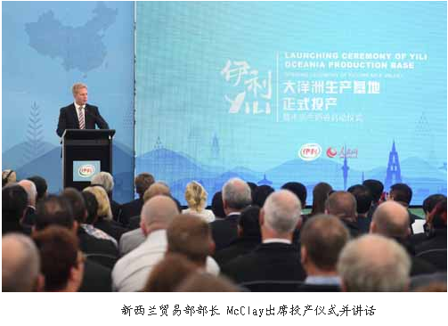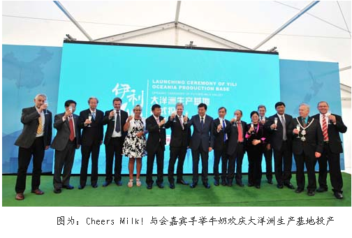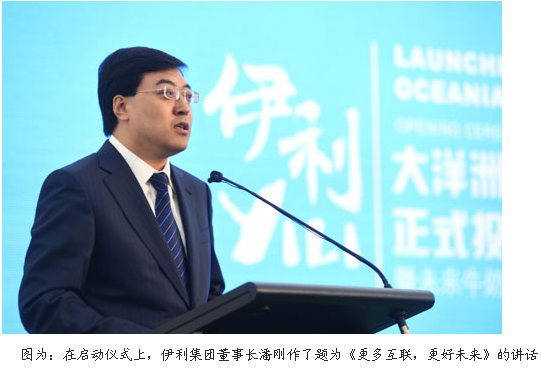 伊利集团董事长潘刚在现场的发言中表示“伊利大洋洲生产基地是面向未来的。”他说:“在北京举办的APEC会议上,习近平主席提出了共建互联互通的亚太新梦想。伊利的互联之路,是有形的,也是无形的。有形在于乳业产业链上的优质资源在加速流动,用全球资源服务中国消费者;无形在于伊利‘全球织网’的战略布局对全球乳业的影响力在日益增强。而无论怎样,关于‘健康、洁净和生态’的标准,始终是伊利的初心和使命。”