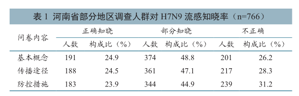 采用自行设计的《H7N9流感认知度调查问卷》,包含调查者基本信息(如年龄、性别、学历和职业等)、H7N9流感防控知识(如基本概念、传播途径和防控措施等)和防护行为(使用防护用品)3个方面。采用便利抽样法调查,获得766份有效资料,将调查结果按正确知晓、部分知晓和不正确分成3类进行统计。