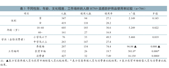 2.4 不同性别、年龄、文化程度、工作场所的人群H7N9流感防护用品使用率比较 参与调查的人群中68.8%(527/766)的人群基本了解H7N9流感的防控措施,但只有27.7%(212/766)的人群在接触生禽时选择使用防护用品(防护服、口罩、手套等)。结果显示,18岁~60岁的中青年、中学及以上学历人员对H7N9流感防护用品使用率较高(P<0.05),禽养殖场从业人员防护用品使用率高于农贸市场涉禽人员和家禽消费者(P<0.05),农贸市场涉禽人员防控护用品使用率高于家禽消费者(P<0.05),详见表3。