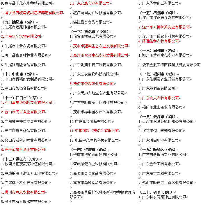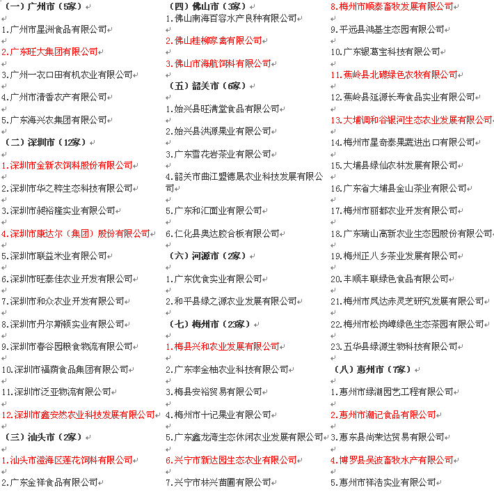 广东省117家重点农业龙头企业候选企业公示