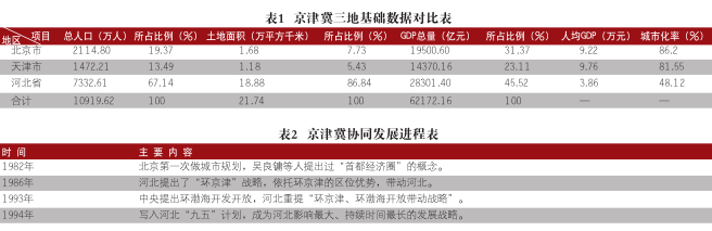 从1982年最早提出京津冀协同发展到现在已经有32年的时间,期间曾4次提出了不同内容的发展合作战略(见表2)。